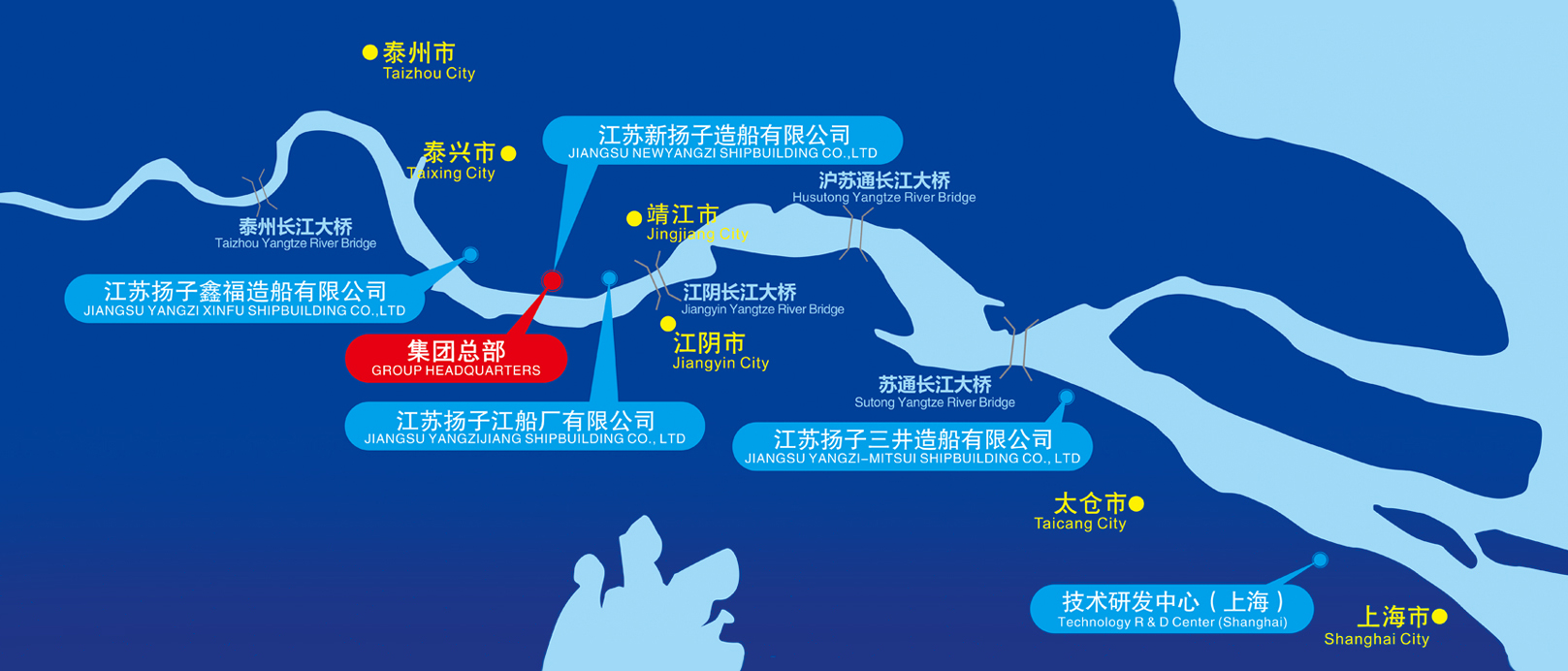 集團公司下轄江蘇新?lián)P子造船有限公司、江蘇揚子鑫福造船有限公司、江蘇揚子三井造船有限公司及江蘇揚子江船廠有限公司4家造船企業(yè),分布于長江下游江蘇省境內的靖江市、泰興市和太倉市的黃金水道兩岸,距上海、南京兩大城市均170公里。