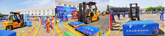 啟動(dòng)儀式后,來自新?lián)P子造船9個(gè)車間/部門舉薦的18名叉車工參加了首場(chǎng)技能競(jìng)賽。叉車工競(jìng)賽項(xiàng)目為勇闖四關(guān)。四關(guān)是指實(shí)干篤行(過S彎道)、強(qiáng)基固本(巧碼貨盤)、專業(yè)精進(jìn)(寬物進(jìn)窄門)、勇攀高峰(搭酒杯塔),項(xiàng)目是對(duì)參賽選手綜合能力的考驗(yàn),要求做到“快、巧、準(zhǔn)、穩(wěn)”,即快速通過障礙、叉運(yùn)寬物進(jìn)窄門、精準(zhǔn)堆放貨盤、平穩(wěn)搭建杯塔。