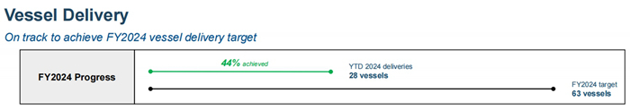 截止2024年5月24日,集團(tuán)各子公司已按期(或提前)交付1800TEU、2400TEU、3300TEU、3500TEU、7000TEU雙燃料、15000TEU、16000TEU多型集裝箱船;散貨船有29800DWT、63200DWT、40000DWT、45000DWT、82000DWT、82500DWT等船型。此外交付一艘40000m3雙燃料液化石油氣/液氨運(yùn)輸船,集團(tuán)首次涉足的甲醇燃料動(dòng)能船型——1260TEU甲醇雙燃料集裝箱船首制船也按期順利交付。截止目前,集團(tuán)今年已交付新造船28艘,完成年度交付計(jì)劃63艘中的約44%。