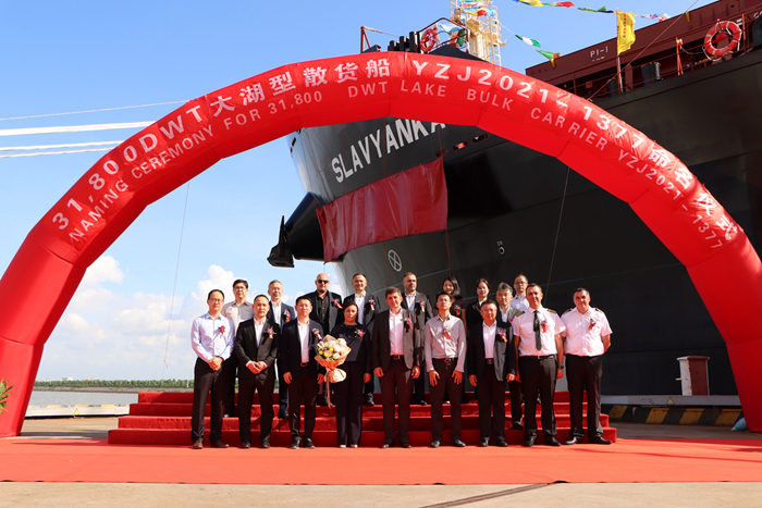 8月2日,揚子三井為保加利亞國家航運公司NAVIBULGAR建造的第二艘31800DWT大湖型散貨船“SLAVYANKA”輪(掛馬耳他旗)順利命名交付。新船的命名儀式于揚子三井碼頭隆重舉行。教母Katya MilevaMutafova女士將新船命名為“SLAVYANKA”輪,為新船砍纜并擲香檳禮,拉響汽笛,祝福新船、隨船船員航行平安,為船東帶來榮譽和財富。