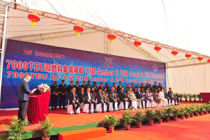 LNG雙燃料7000TEU集裝箱船是我司全面轉(zhuǎn)型建造綠色新能源船舶的標志性船型,是國內(nèi)首制搭載B型燃料罐雙燃料中型集裝箱船。該項目共計15艘系列船,均由我集團新?lián)P子造船承建。10月26日,我集團與SEASPAN、ZIM公司在新?lián)P子造船有限公司,為首批3艘姊妹船舉行了隆重的命名儀式。