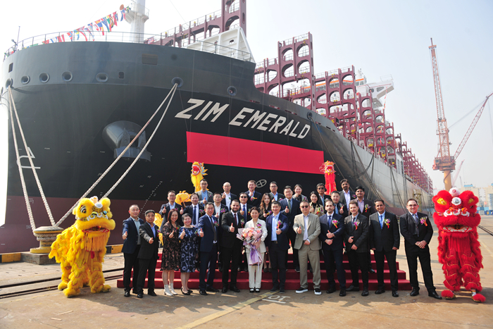 Cindy Li 女士將N1371船命名為“ZIM EMERALD”輪。嘉賓們共同與新船合影留念,祝福新船在未來的每一次航程中,順風順水,為船員帶來平安,為船東和合作各方帶來財富和榮耀。