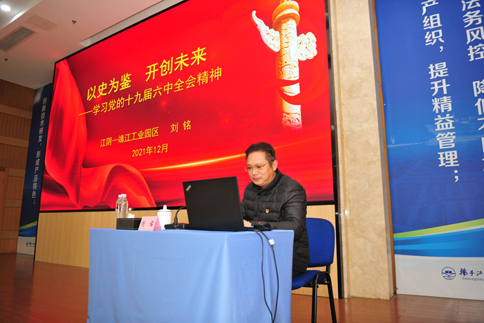 為深入學(xué)習(xí)宣傳貫徹黨的十九屆六中全會精神,12月29日下午,公司特邀江陰市委宣講團(tuán)成員、園區(qū)黨委委員、紀(jì)委書記劉銘來司進(jìn)行黨的十九屆六中全會精神宣講。