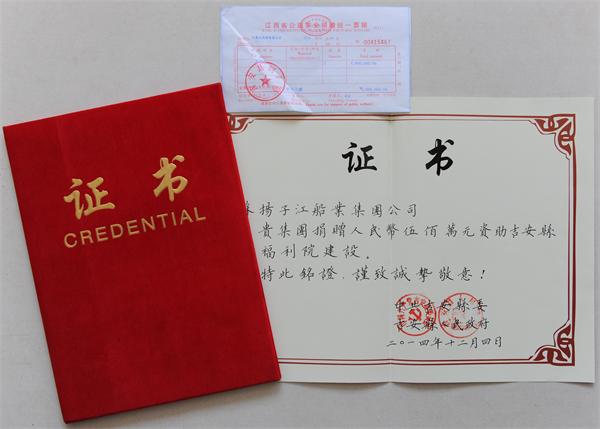 12月4日,江蘇揚(yáng)子江船業(yè)集團(tuán)公司向江西吉安縣捐贈人民幣五百萬元,專項(xiàng)用于吉安縣社會福利院建設(shè)。